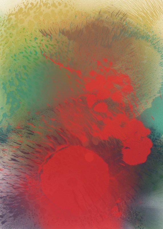 Resonant Imagery is a collaborative integration of printing (Saenz) and new media (McCoin) methodologies combined to create a 35-piece portfolio of cymatics sourced printed works. In this context, cymatics refers to the vibrations of frequency-specific sound waves being played through a speaker, and used as the activation energy to move print-based materials (toner, flocking, ect.) into visual patterns. A thin metal plate with an attached piece of paper is mounted on top of an audio speaker laying face-up on a table. On top of the paper is placed a small mound of toner or flocking powder. Specific monophonic frequencies and waveforms (sine, square, etc.) are fed into the speaker via synthesizer, to vibrate the plate/paper, which in turn creates a visual pattern with the toner or flocking. The resulting visual patterns are captured, scanned, and used as source materials for a print. The color choices come from an application that generates colors that are resonant with the specific sound frequencies used for each pattern.